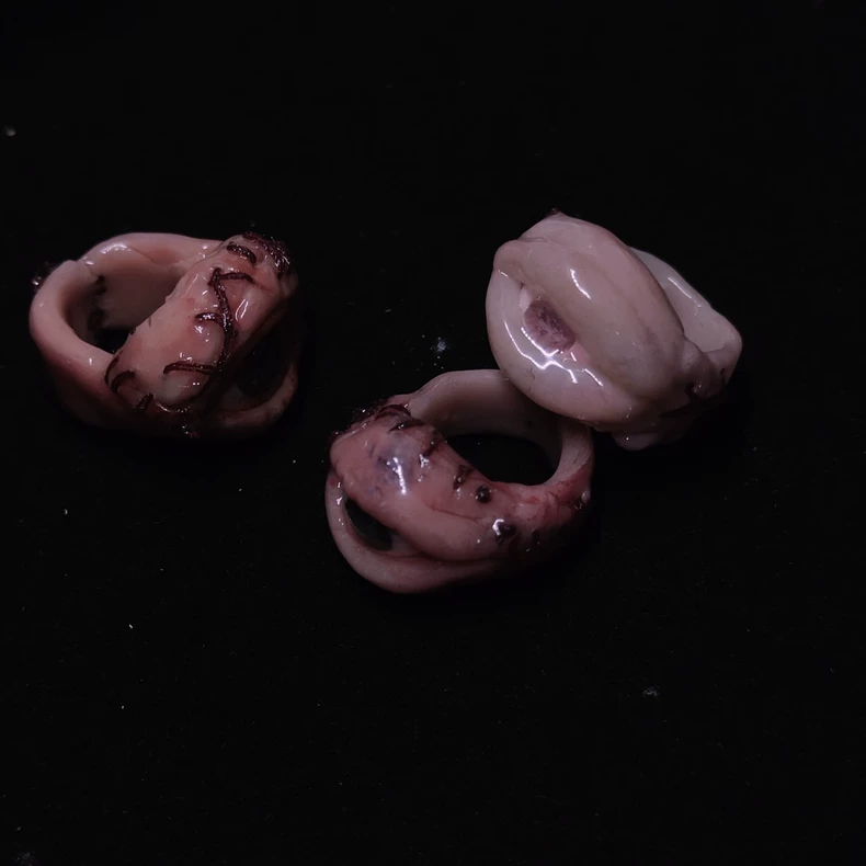 Crafted from resin clay and plaster. Due to the nature of the hand-sculpting process, each ring is a unique iteration: the stitch placement, the pattern of blood streaks, and the angle of the gaze vary slightly.