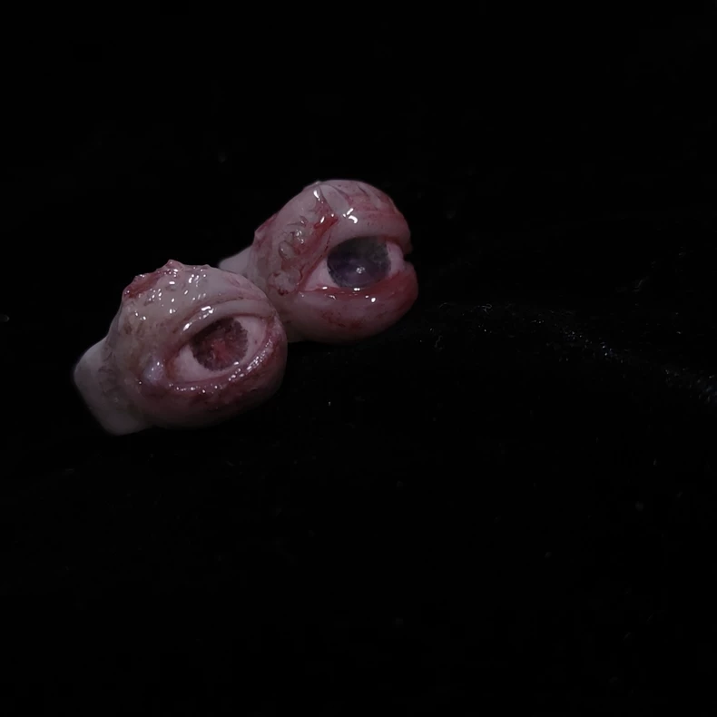 Every visceral detail is shaped by hand: the subtle “moisture” sheen on the cornea, the swollen relief of tissue around each stitch, the unique pattern of every crimson thread. This process ensures that what you wear is not a mass-produced object, but a unique artifact of crafted sensitivity, wrapping the concept of “fleshly suffering” in a form that is eerily and beautifully intimate.